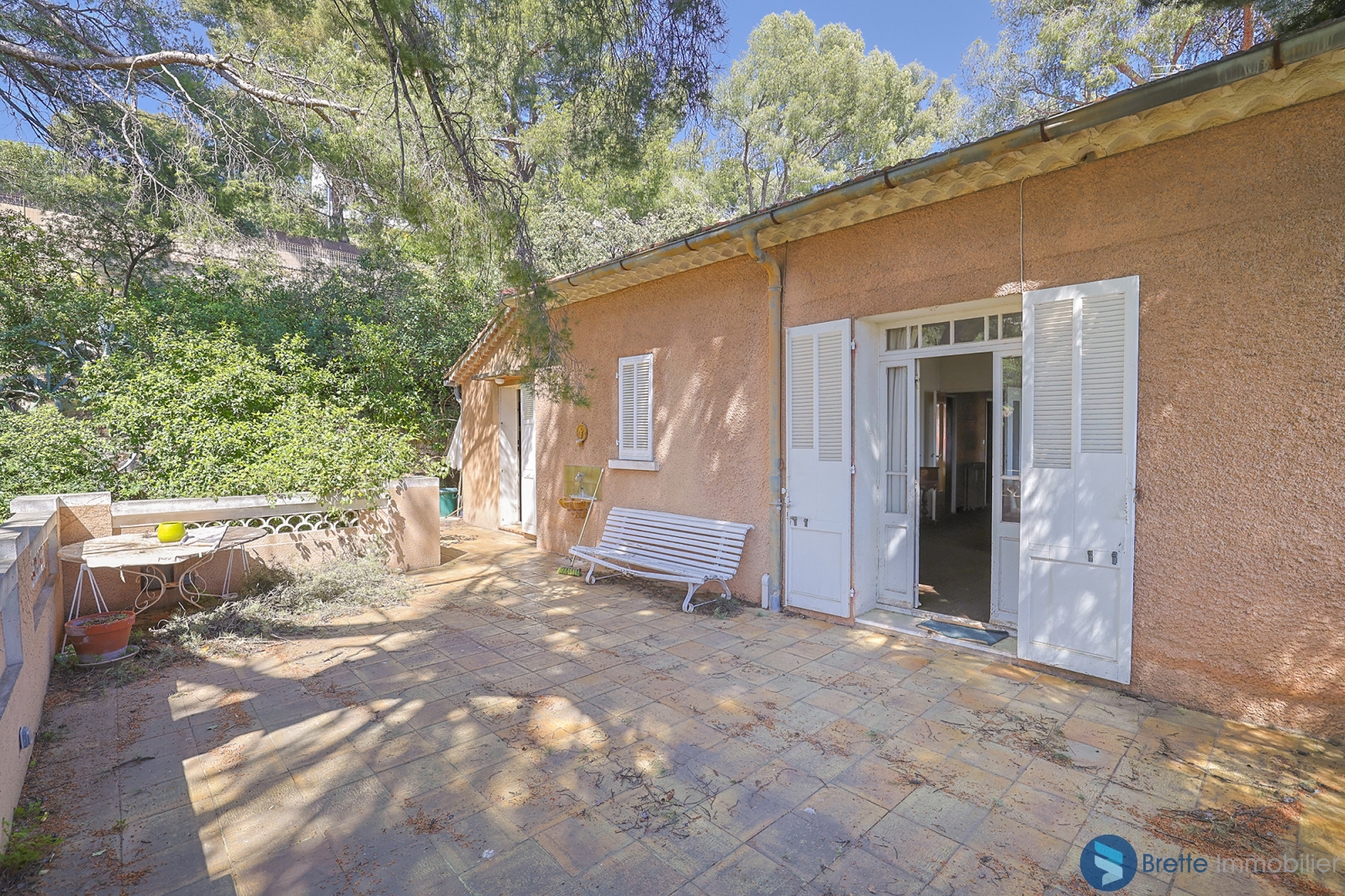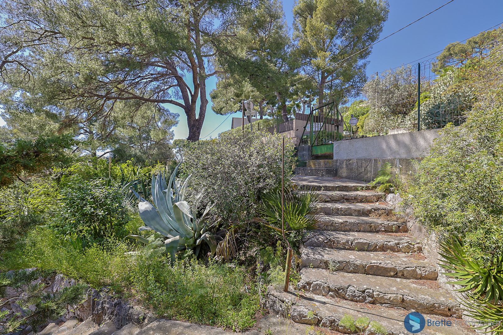 Le bien est implanté sur un terrain en restanques de plus de 2 000 m², dans un environnement naturel avec pins et végétation méditerranéenne.